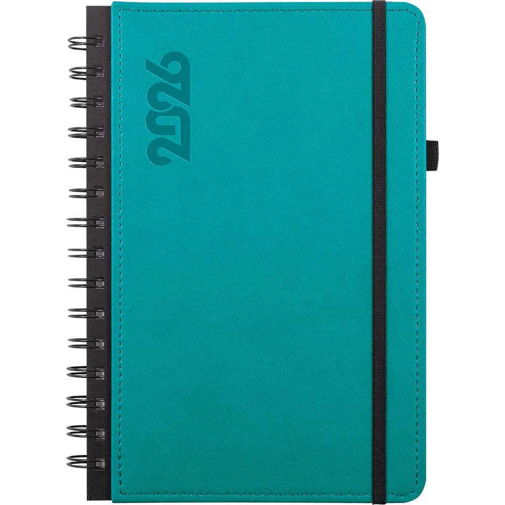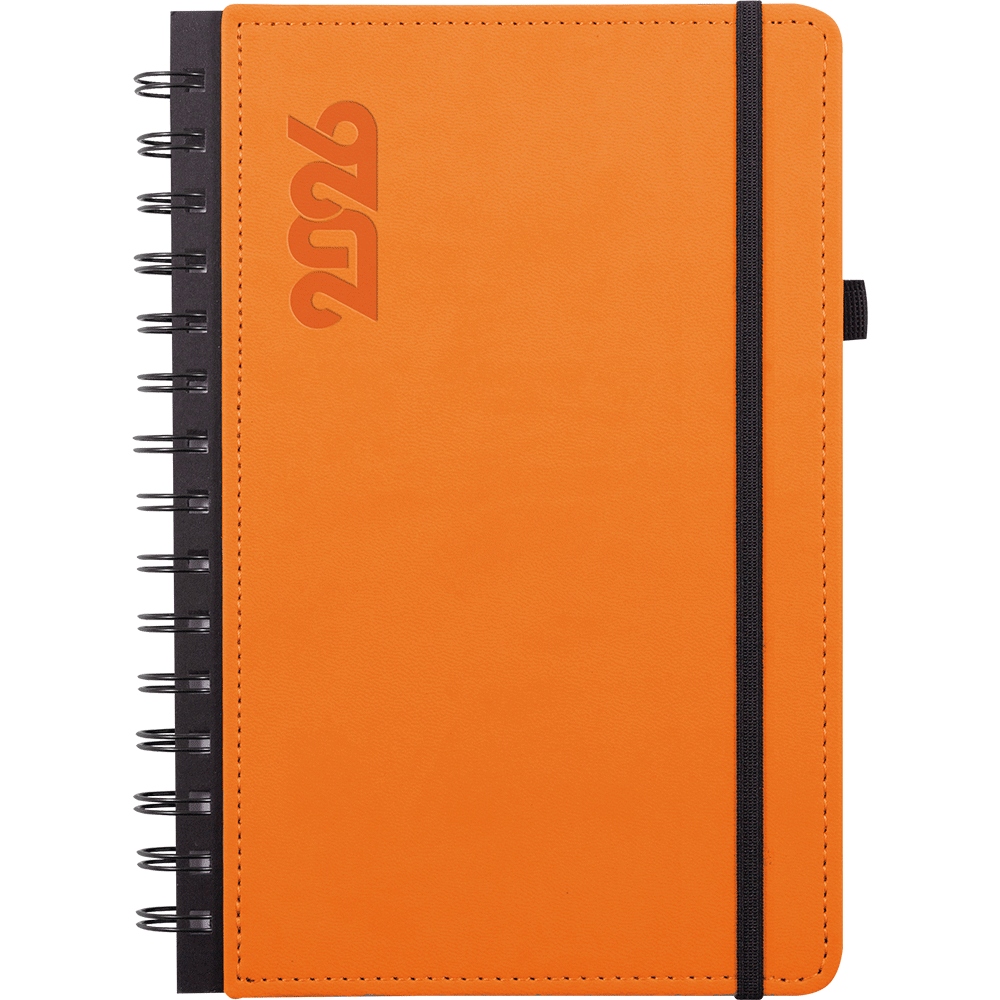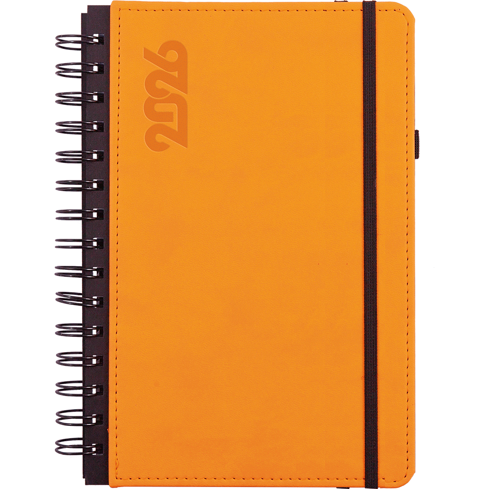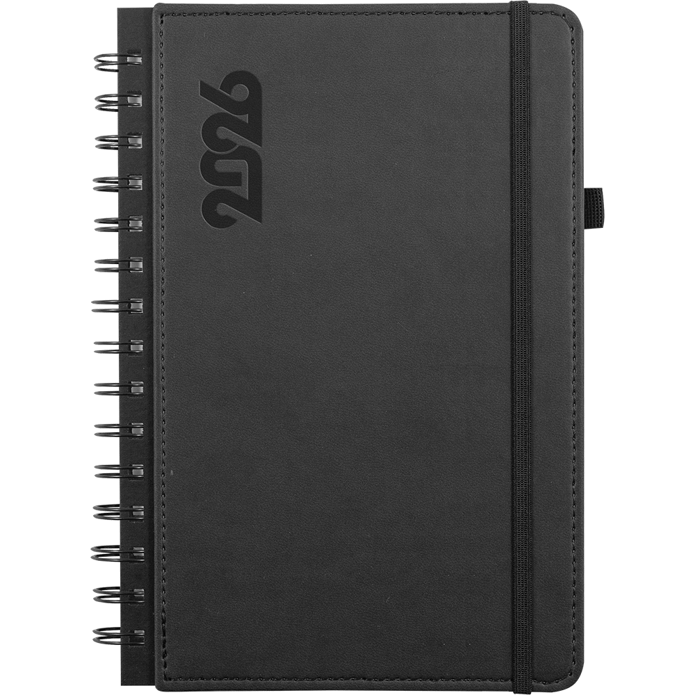 Agenda cu spira si coperti din material caserat pe carton de legatorie negru si elastic de agenda in culoare.