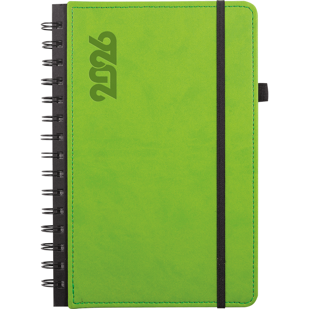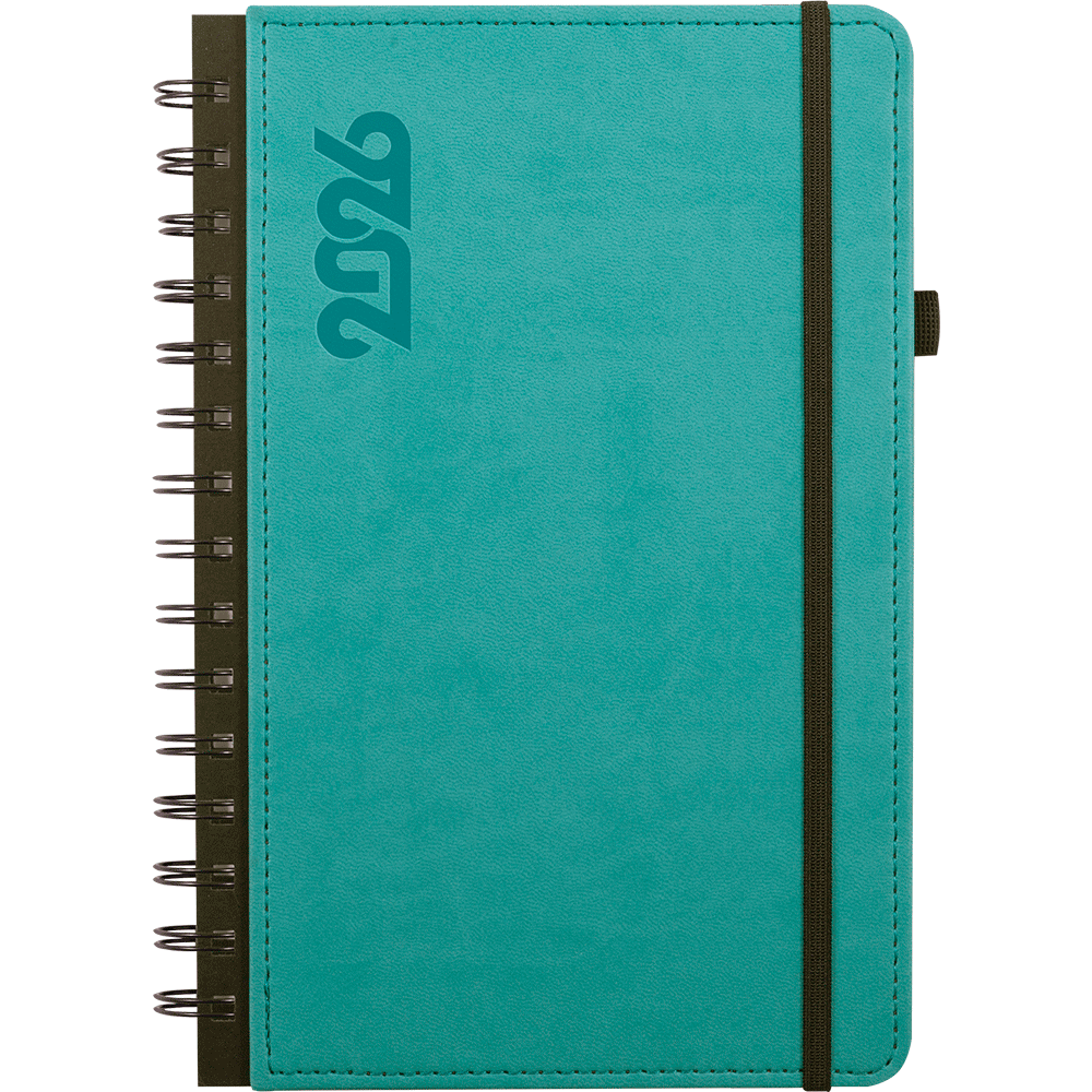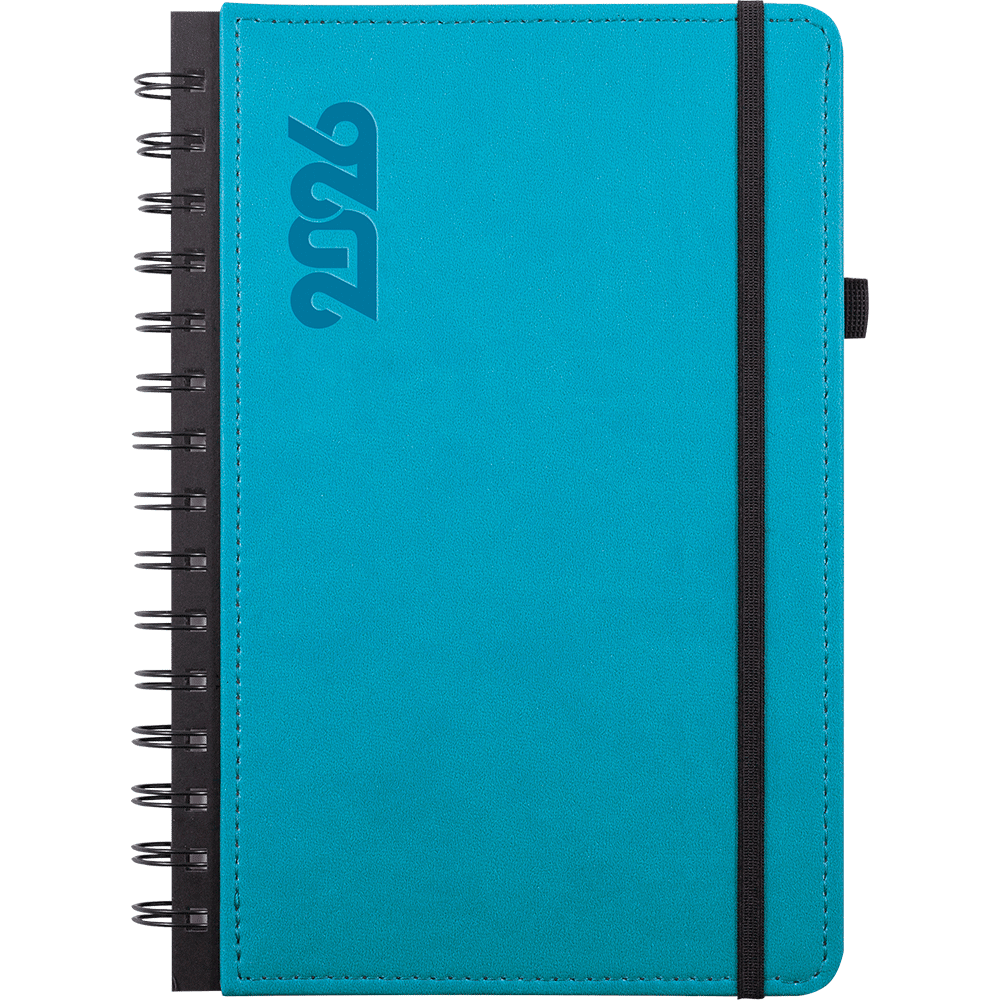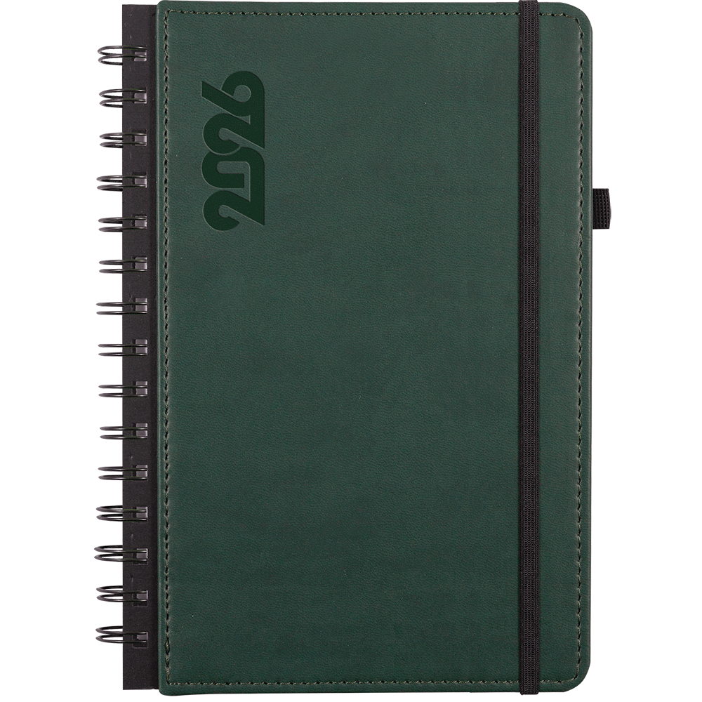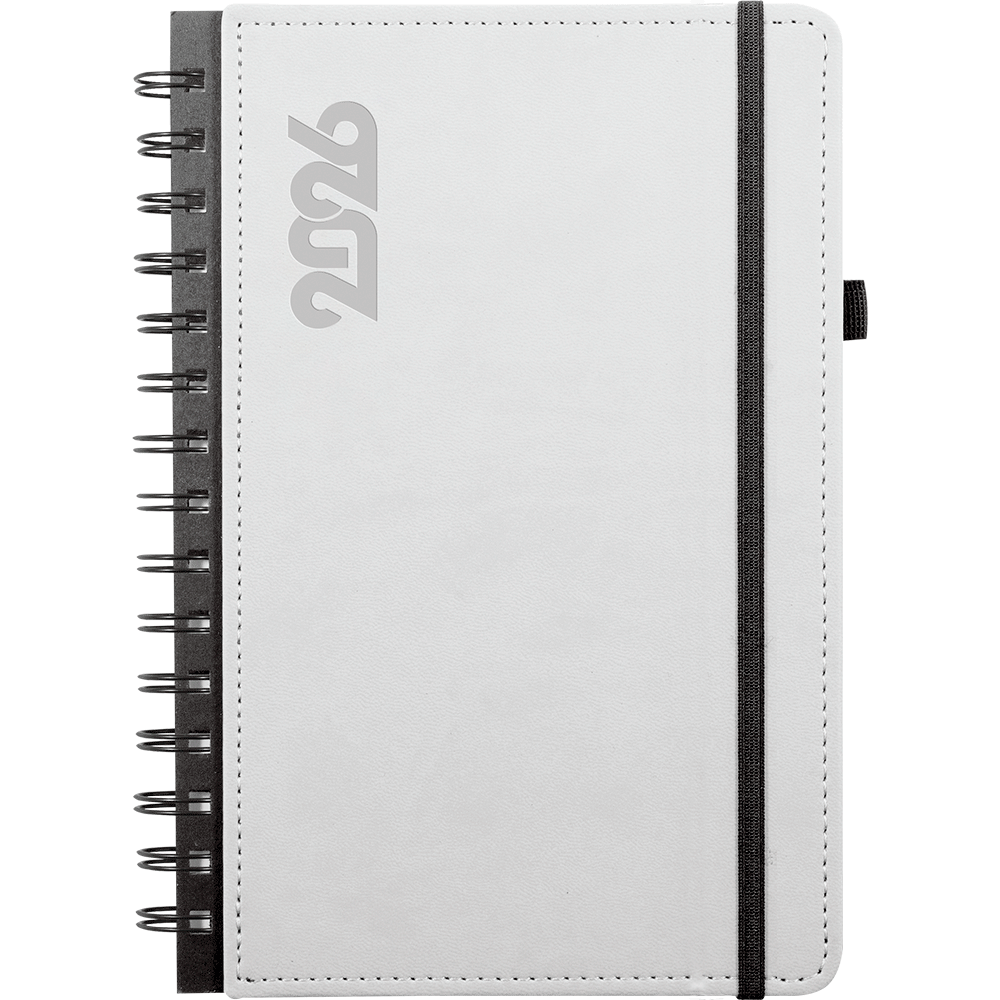 Agenda cu spira si coperti din material caserat pe carton de legatorie negru si elastic de agenda in culoare.